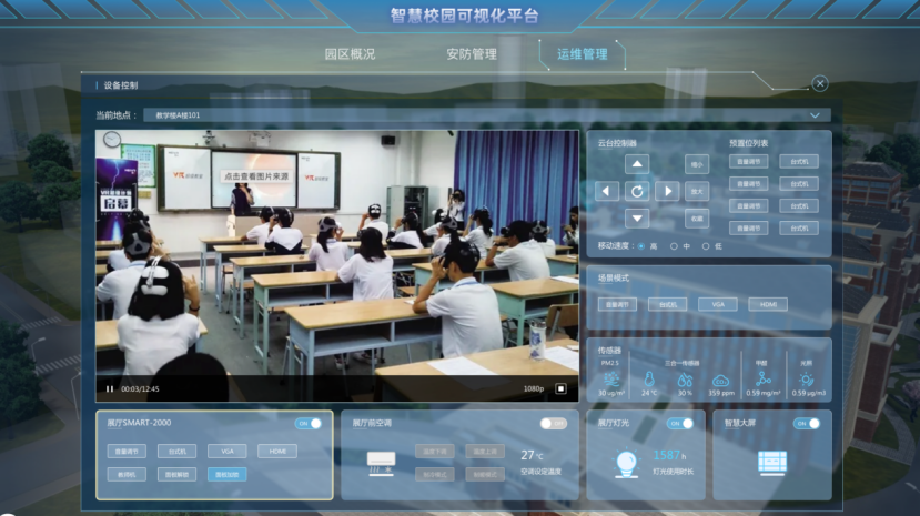 登陆成功之后进入看到园区概括页面,在此页面可以看到我们系统由“园区概括”“安防管理”“运维管理”三大菜单组成。页面停止操作30秒自动进入轮巡功能。